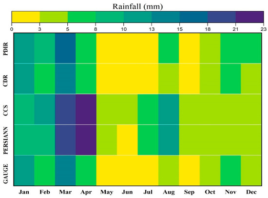The UAE usually observes rainfall in the winter months, and the summer months are particularly dry. Therefore, a comparison of the monthly average rainfall values is necessary to reveal the accuracy of the selected products. Figure 5 shows the monthly evaluation of the PERSIANN family products in contrast with the gauge values. The figure indicates that the high rainfall months in the UAE are January–April, whereas other months show considerably less rainfall values as shown from the gauge heat bar. May–July are the driest months of the year, which is correctly estimated by CDR and PDIR as well where the average monthly values are less than 3 mm. Almost all the products matched the gauge data in terms of the highest monthly average value in March, except for PERSIANN and CCS, which show the highest rainfall in April. The month of November also reveals considerable rainfall over the UAE during the study period, and both CDR and PDIR show a similar pattern, while the other two products could not capture it. A significant amount of rainfall in August was detected by PERSIANN and CCS (<10 mm), whereas rain gauges and CDR reported an average value of less than 5 mm for that month. Overall, CDR and PDIR are best in terms of mean monthly rainfall as compared to the rain gauge data. PERSIANN and CCS showed a significant overestimation of the monthly rainfall with relatively varying monthly distribution of rainfall.