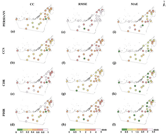 CDR, PDIR, and CCS show a comparative spatial distribution in terms of MAE (Figure 6j–l), with an average MAE between 0.5 and 1.5 mm. However, CCS also showed MAE values greater than 3 mm for two stations as shown in Figure 6j. PERSIANN product showed the maximum MAE values in the range of 2.5–3.5 (Figure 6i).