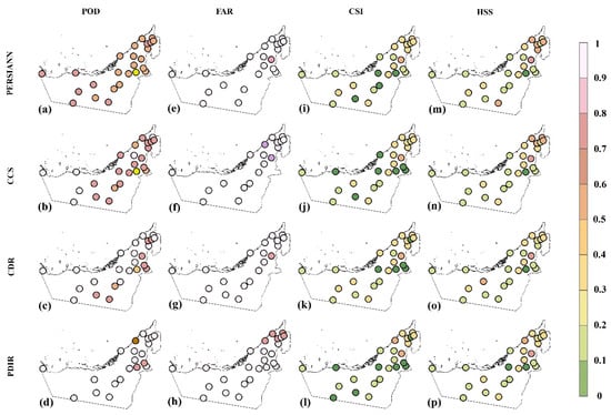 Figure 7. Detection accuracy of the PERSIANN family products using probability of detection (POD) (ad), false alarm ratio (FAR) (eh), Critical Success Index (CSI) (il), Heidke Skill Score (HSS) (mp). Each horizontal row represents one product. The color bar represents all four contingency attributes.