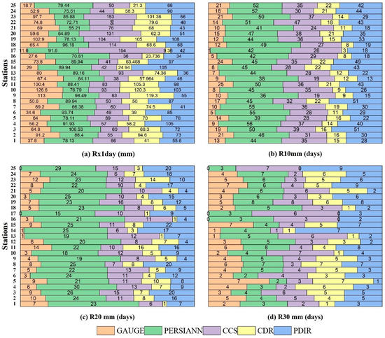 Figure 8. Climate indices comparison between the rain gauge observations and PERSIANN satellite products. (a) R × 1 day (mm) values for gauge vs. satellite products. (bd) The same for R10, R20, and R30 mm.