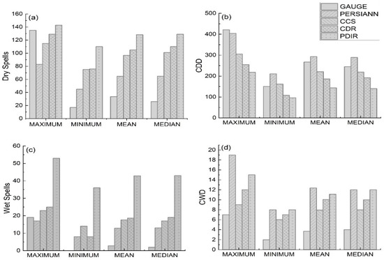 Consecutive dry and wet days (CDD and CWD) are calculated and shown in Figure 9b,d. The minimum threshold was set as 1 mm for the calculation of both indices. To understand the indices, mean, maximum, minimum, and median values are calculated and plotted for gauge and satellite products. In addition, the number of dry and wet spells is calculated and shown in Figure 9a,c. The threshold of 3 consecutive days was set to calculate both. Figure 8b demonstrates that all the products underestimated the mean CDD by a comparable margin, except for the PERSIANN product, which overestimated the mean value by 5–10%. Similarly, the same trend can be seen for minimum and median values. However, for maximum CDD, all the products underestimated the gauge data significantly. This shows that actual gauge data have many dry days as compared to the PERSIANN family products, which showed fewer number of CDDs. However, in terms of dry spells, all the products overestimated the minimum, mean and median dry spells. For maximum values, they were in good comparison with the gauge data. In contrast, the CWDs analysis (Figure 9d) has shown the opposite trend with the gauge data showing comparatively lower CWD than the satellite products, while all the PERSIANN family products significantly overestimated the consecutive wet days. For instance, the mean CWD values were calculated as 4 for the gauge data for the whole period, while the satellite products gave the mean days in the range of 8–12. The display trend of wet spells was not very different than the CWD plots as shown in Figure 9c.
