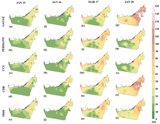 Four major events that occurred during the study period, were selected. These rainfall events occurred in January 2015, January 2016, March 2017, and January 2020. Maximum daily rainfall values were considered to develop the spatial distribution of the events throughout the UAE. March 2017 and January 2020 rainfall events caused substantial floods and damage across the country, and therefore, the importance of accurately predicting such events becomes paramount. Figure 10 displays the spatial maps for the four events based on the gauge observations and the four PERSIANN family products for comparison. Plots a–e, f–j, k–o, and p–t on vertical direction represent the events while plots a–p, b–q, c–r, d–s, and e–t represent the gauge, PERSIANN, CCS, CDR, and PDIR, respectively. The March 2017 and January 2020 events were more severe than the other two events, as the maximum rainfall value approached 95 and 148 mm, respectively.