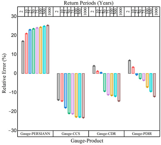 To further check the robustness of the PERSIANN family products, IDF curves were prepared and compared with the gauge data. The IDF curve development procedure has been explained in Section 2.7 in detail. The intensity of rainfall was determined for various return periods for 24 h duration (Appendix A, Figure A1). Figure 11 displays the relative error of IDF curves across the whole spatial domain for the selected duration and the return periods of 2, 10, 25, 50, 75, 100, 500, and 1000 years. While the errors are considerable for PERSIANN and CCS products, they are less significant for CDR and PDIR. For PERSIANN product, the error ranges from 17% to 25%, while for CCS, it ranges from −14% to −24%. For CDR and PDIR, the error ranges from 4% to −15% and from 6% to −14%, respectively. Additionally, errors are more obvious in high-return periods, which can be attributed to the shorter records of the rainfall data used for the analysis. The IDF values calculated with PERSIANN product always overestimated the gauge IDF values by more than 15%, while for CCS, there was a considerable underestimation by more than −14%. CDR and PDIR overestimated the 2-year return period, and the error was the least for the 25-year return period for both products. For higher return periods, the IDF values were mostly underestimated with the maximum error up to −14%. The error margin would be less pronounced with a longer duration of the data used for the calculation of IDF curves.