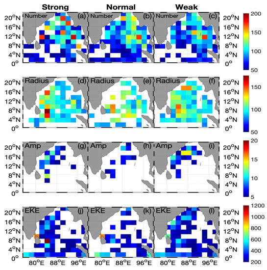 Mean spatial distribution of eddy number (a–c), eddy radius (km; d–f), amplitude (cm; g–i), and EKE (cm2 s−2; j–l) for anticyclonic eddies (AEs) averaged for the strong (left column), normal (middle column), and weak (right column) monsoon years, with the respective thresholds (see text for details) applied. In the top row, white squares denote less than 50 eddies over the full-time period. In the second row, white squares denote a mean eddy radius of less than 50 km. In the third row, white squares denote an average eddy amplitude of less than 5 cm. In the fourth row, white squares denote an average EKE of less than 200 cm2 s−2.