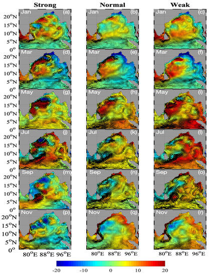 Bi−monthly SLA (shaded region, cm) and surface geostrophic currents (vectors, m s−1) in the Bay of Bengal averaged for the strong (left column, (a,d,g,j,m,p)), normal (middle column, (b,e,h,k,n,q)), and weak (right column, (c,f,i,l,o,r)) monsoon years, respectively. The years associated with each classification in this composite and the others are listed in Section 2.