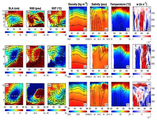 Figure 4 presents the surface and vertical characteristics of the Sri Lanka Dome (SLD, cyclonic eddy) that developed off Sri Lanka in July during the different monsoon regimes based on NEMO model simulations [73]. The central axis of the SLD is located at 9° latitude during strong monsoon regimes and at 8°N and 7°N latitudes during normal and weak monsoon regimes, respectively. Vertical sections of density, salinity, temperature, and vertical velocity are presented along the zonal section (~9°N latitude) crossing the SLD during the strong monsoon regime (Figure 4a–c). Warm and high salinity waters occupy the center of the SLD, and as a consequence, SLA at the center of the SLD is weakly negative during the strong monsoon regime (Figure 4a–c). The center of the SLD is more intense, with the lowest negative SLA during the normal and weak monsoon regimes (Figure 4h,o), coinciding with intensified cyclonic currents in the SLD. In the normal regime, SLD encounters high (>34) salinity and cooler (~28 °C) surface waters (Figure 4i,j). In contrast, cooler and higher salinity surface waters appear in the SMC flow, while warmer (29.2–29.8 °C) and low (33.0–33.2) salinity surface waters occur on the western flank of the SLD during the weak monsoon regime (Figure 4o–q).