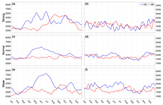 A comparison of EKE in the western Bay and eastern Bay shows that the western Bay is dominated by larger and fewer eddies than its eastern counterparts. The eastern Bay is dominated by many small eddies, commonly generated by coastal Kelvin waves, which are in agreement with the findings of [20,21]. Weak monsoon conditions are the only scenarios that show strong CEs, with peaks in March, June, and July in the eastern BoB (Figure 6f). The western Bay is cyclonic eddy dominated during the first half of the strong monsoon year, and anticyclonic eddy dominated after July, indicating a direct seasonal response to basin-scale monsoon-directed flow (Figure 6a,c,e). In fact, the strong monsoon condition was the only one under which AEs dominated after July. The maximum CE EKE in the western Bay is similar between all years, with values of about 6000 cm2 s−2 (closer to 7000 cm2 s−2 in the strong monsoon conditions). The temporal period when AE EKEs exceed CE EKEs in the western Bay strongly varies from less than a month during normal conditions in early September to a three-month period in the strong monsoon from mid-July to mid-October (Figure 6a,c,e). In the eastern Bay (Figure 6b,d,f), the values of AE EKEs and CE EKEs are about the same, fluctuating around 2000 cm2 s−2. There is a period from March through July, when the eastern Bay’s EKE is dominated by CEs during weak and normal monsoon regimes (Figure 6d,f), but fluctuates between AE- and CE-dominant for strong monsoons (Figure 6b).