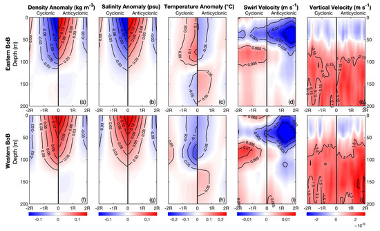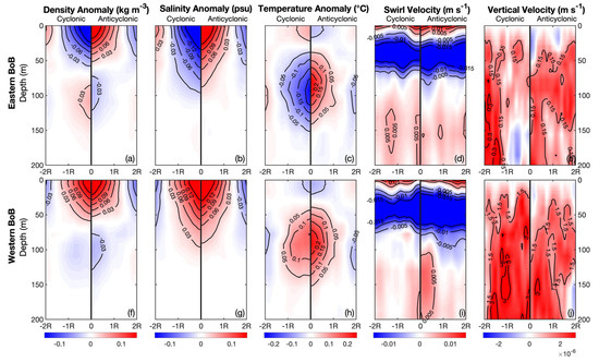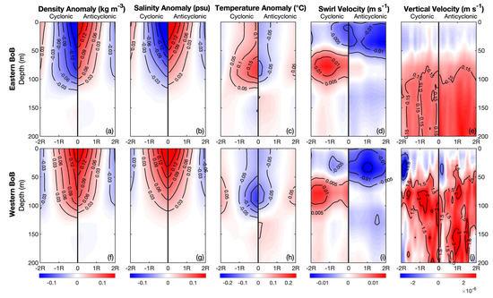 Zonal cross-section across the composite cyclonic eddy (left part) and anticyclonic eddy (right part) in each subplot during the normal monsoon years averaged. Density anomaly (kg m−3; a,f); salinity anomaly (psu; b,g); temperature anomaly (°C; c,h); swirl velocity (meridional component; m s−1; d,i); vertical velocity (mm s−1; e,j) within two normalized radii of the eddy center in the eastern Bay (>90°E; a–e) and western Bay (<90°E; f–j).