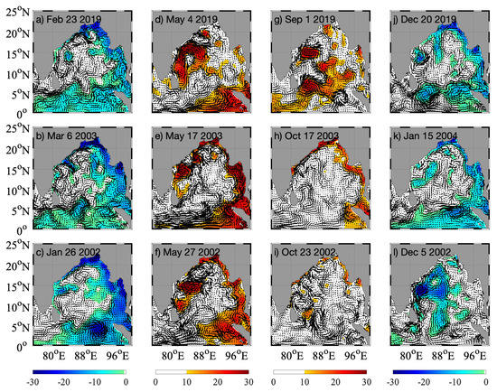 Figure 10 shows the variation of SLAs and the associated surface geostrophic currents during the propagation of the first upwelling Kelvin wave (Figure 10a–c), first downwelling Kelvin wave (Figure 10d–f), second downwelling Kelvin wave (Figure 10 g–i), and second upwelling Kelvin wave (Figure 10j–l) along the coasts of Sumatra and the Andaman Sea from the equatorial Indian Ocean. Since we are focusing on the different monsoon regimes, we will concentrate on the SLA distributions during the propagation of the first downwelling and second upwelling Kelvin waves during the strong monsoon regime (Figure 10d,j), the normal monsoon regime (Figure 10e,k), and the weak monsoon regime (Figure 10f,l). During the strong monsoon regime, large mesoscale AEs are generated in both the western Bay and east of Sri Lanka (Figure 10g), while smaller mesoscale AEs are generated in the central and northern Bay (Figure 10d,j). A large-scale CE or Sri Lanka Dome (SLD) is also generated off eastern Sri Lanka (Figure 10d,j). During the normal monsoon regime (2003), a cyclonic SLD is generated on the western flank of a strong SMC, while elongated AEs are generated on the right flank. Smaller mesoscale AEs and CEs are generated elsewhere in the BoB (Figure 10e,h,k). During the weaker monsoon regime (2002), the currents associated with the SMC, AEs, and SLD are strong (Figure 10c,f,i,l); mesoscale AEs are dominant elsewhere during the first downwelling Kelvin wave propagation (Figure 10f).