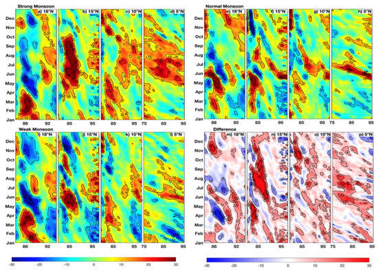 At 5°N, the westward propagation of Rossby waves is dominant. SLAs are large and positive during the monsoon seasons (May–September) of all regimes, resulting in weaker differences in SLA (Figure 10p). The 10°N latitudes extend into the Andaman Sea, and the variation of SLA at the eastern longitude (>95°E) represents its association with the coastal Kelvin wave and its westward radiation as a Rossby wave. During the weak monsoon regime, the first upwelling Kelvin wave (SLA, −10 cm) occurs from February–March, followed by downwelling Kelvin waves (SLA, +10 to +20 cm) from May to August and then from October to December (Figure 11k). During the strong and normal monsoon seasons (Figure 11c,g), only the downwelling Kelvin wave during June–September is apparent. SLA differences between the strong and weaker monsoon regimes are higher and positive at 15°N and weaker yet positive at 10°N (Figure 11n,o). The patterns of differences describe the propagation of eddies on the background Rossby waves (Figure 11p).