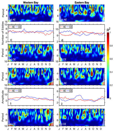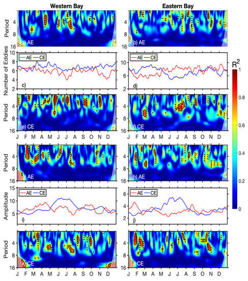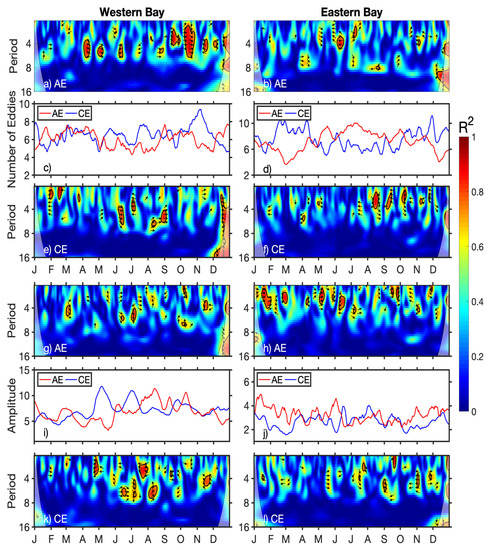 To provide statistical confirmation of the relationship between the eddy parameters observed and atmospheric precipitation and OHC, wavelet coherence analysis was conducted for all three monsoon regimes and is presented in Figure 12, Figure 13 and Figure 14 for the western and eastern Bay regions separately. It should be noted, however, that due to the comprehensive action of many factors that influence precipitation, including thermal, dynamic, water vapor and microphysical processes, this is an oversimplification. Future work is needed to isolate each individual forcing, which is outside the scope of this paper. There is higher wave coherence between the number of AEs and precipitation than the CEs during the strong monsoon regime, particularly in the western BoB during October and the post-monsoon period (Figure 12a–f). In the eastern BoB, the relationship between the number of AEs and precipitation was coherent during June–July. Similarly, the relationship between the number of CEs and precipitation was coherent during the intermonsoon periods. There was a more annually consistent relationship with minimal seasonal fluctuations during the normal monsoon regimes between the number of AEs and precipitation for both zonal halves of the BoB (Figure 13). The relationship between the number of CEs and precipitation was more coherent in the western BoB than in the eastern BoB and was strongest during the intermonsoon periods (Figure 13e). This was also true for high-amplitude CEs in the western Bay, but the relationship between high-amplitude CEs and precipitation in the eastern Bay peaked during the summer monsoon (Figure 13l). The relationship between the number of AEs and precipitation was again relatively strong throughout the year but was particularly coherent in March, August, and September (Figure 13b). The weak monsoon regime is the only one that shows a relatively similar wave coherence response between the eastern and western Bay (Figure 14). The relationship between the number of eddies and precipitation is slightly stronger for AEs, while the relationship between eddy amplitude and precipitation is slightly stronger for CEs throughout the Bay, with no notable seasonality other than the June–July peak (Figure 14f).