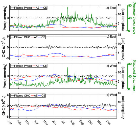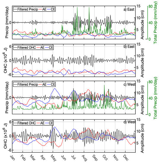 Time series of 3–7-day filtered precipitation (mm day−1), total precipitation (mm day−1), over the Bay of Bengal, amplitudes of anticyclonic eddies (red), and amplitudes of cyclonic eddies (blue) and ocean heat content (×106 J) in the (a,b) eastern bay (>90°E) and (c,d) western Bay (<90°E) during the weak monsoon years averaged.