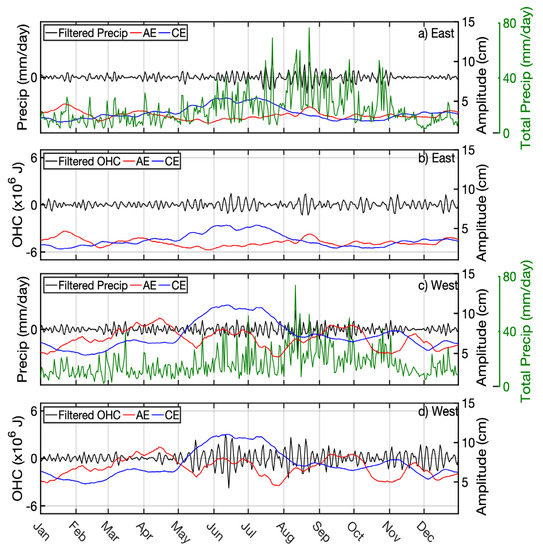Time series of 3–7-day filtered precipitation (mm day−1), total precipitation (mm day−1), over the Bay of Bengal, amplitudes of anticyclonic eddies (red), and amplitudes of cyclonic eddies (blue) and ocean heat content (×106 J) in the (a,b) eastern bay (>90°E) and (c,d) western Bay (<90°E) during the normal monsoon years averaged.