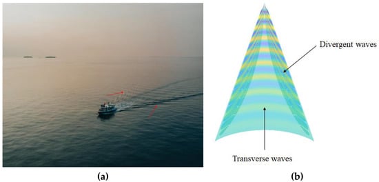 Kelvin wake. (a) Kelvin wake realistic view, the red arrows indicated the kelvin wake. (b) Kelvin wake model simulated.
