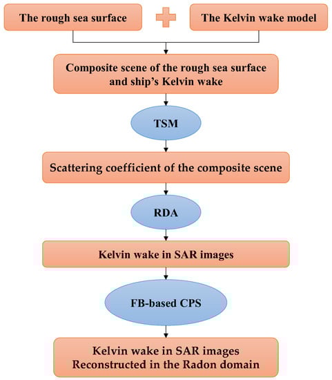 Some of the abovementioned studies simulated only the ship wakes in SAR images and did not detect the ship’s wake. Some studies discussed only the effect of the sea state on the detection of the ship wake in SAR images and did not discuss the influence of the ship’s parameters, such as the ship’s speed and azimuth angle. Based on this, the effect of the ship’s parameters on the detection of Kelvin wake in the numerically simulated SAR images was considered in this paper, further using the detected result to evaluate the effect of ship speed and azimuth angle on the wake’s physical field. First, the Kelvin wake geometry was modeled based on the classic theory of ship wave generation []. Then, the scattering echo of the Kelvin wake was calculated using the two-scale method (TSM). The SAR images of the Kelvin wake were simulated using the range-Doppler algorithm (RDA). Finally, the wake was reconstructed in the Radon domain using Cauchy proximal splitting (CPS) based on the forward–backward (FB) algorithm. The flow diagram that simulates the Kelvin wake detection in SAR images is shown in Figure 2. In addition, speckle-free SAR images of the ship’s Kelvin wake were combined with gamma noise sequences to simulate the influence of actual jammers on ship Kelvin wake detection.