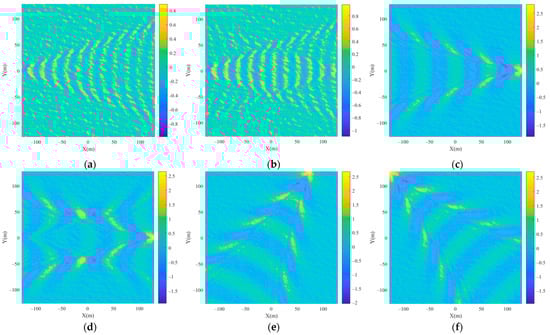 Composite scene of the rough sea surface and ship’s Kelvin wake at different ship speeds, ship azimuth angles, and viscosity coefficients. (a) ; (b) ; (c) ; (d) ; (e) ; (f) .