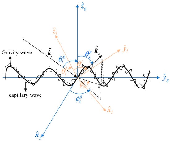 Two-scale sea surface model. The global coordinate systems are fixed on the Earth, whereas is the local coordinate system fixed on the facet of the rough sea surface.