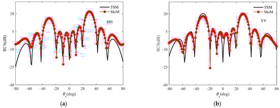 In Figure 5, the bistatic scattering of the cosine surface is calculated by the method of moment (MoM) and TSM. The frequency of the incident wave is . The dielectric constant of the cosine surface is . The incident angles are , . The size of the cosine surface is 6λ × 6λ. As shown in Figure 5, the results of the TSM agree well with the results of the MoM. Therefore, the TSM is effective.