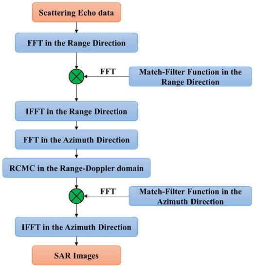 The RDA [] was used to simulate the Kelvin wake in SAR images in this paper. This algorithm consists of three main steps: range compression, range cell migration correction (RCMC), and azimuth compression. Range compression contains fast Fourier transform (FFT) in the range direction and inverse fast Fourier transform (IFFT) in the range direction; the azimuth compression is achieved by the IFFT in the azimuth direction. A detailed flow of the RDA is shown in Figure 6. With this algorithm, the scattering echo data obtained by the TSM are processed to obtain the Kelvin wake in SAR images.