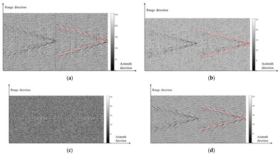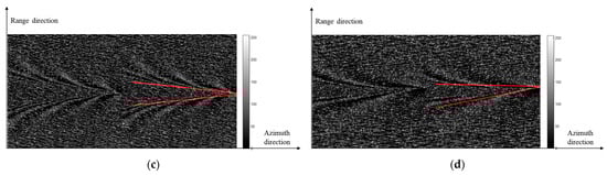 In Figure 15, the influence of various ship speeds on Kelvin wake detection in numerically simulated SAR images is compared. The ship’s speeds are (Figure 15a), (Figure 15b), (Figure 15c), and (Figure 15d), respectively. The wind direction is . The ship azimuth angle is . The wind speed is . The azimuth and pitch angles are both . The SAR integration time is 1 s. Simulations with the X-band are performed for HH.