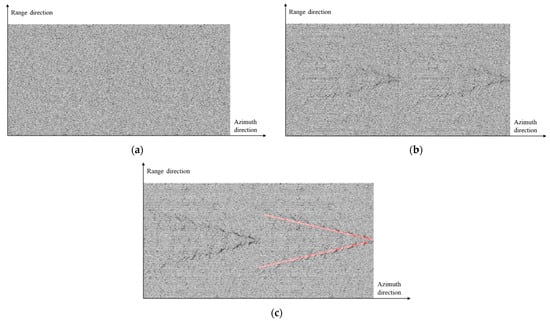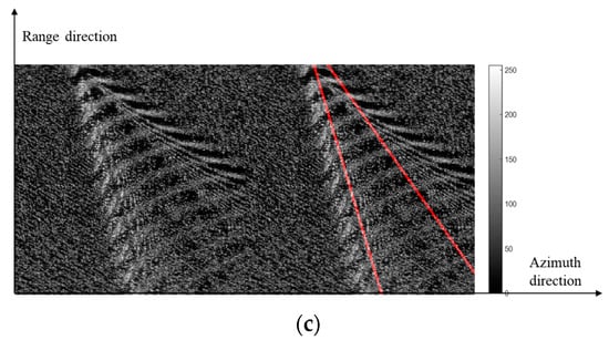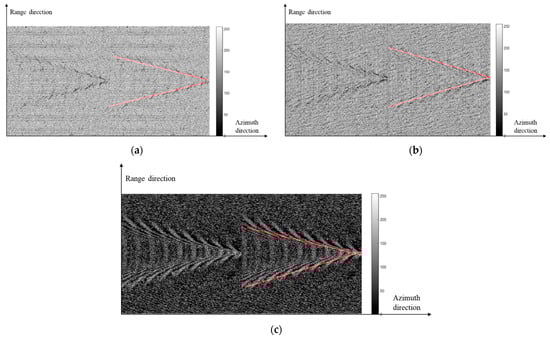 Kelvin wake in numerically simulated SAR images and detection results at different ship azimuth angles. (a) ; (b) ; (c) .