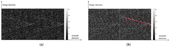 Artificial interference detection of the Kelvin wake in SAR images (; ). (a) Original image; (b) speckled image.