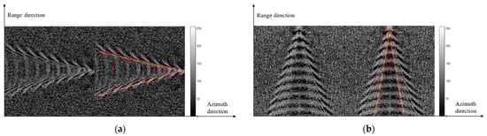 In Figure 17, the Kelvin wake in numerically simulated SAR images and its detection results are presented with various ship azimuth angles. The ship’s speed is . The ship azimuth angles are , , and . The wind speed is . Other parameters are consistent with Figure 15. As seen from the figure, SAR is more sensitive to Kelvin wake propagating along the radar look directions. Therefore, the Kelvin wakes in numerically simulated SAR images are unsymmetric except for those perpendicular to and parallel to the radar motion direction. Moreover, the Kelvin arms in any ship’s azimuth angle were detected.