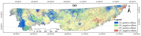 The temporal NPP trends are spatially heterogeneous and rise by 4.81 gC·m−2·yr−1 overall. The NPP increases are concentrated in the western, south-central, and eastern areas, while the decreases occur in the east-central, west-central, and eastern coastal areas (Figure 3b). Such a pattern indicates high variability caused by heterogeneities in climatic conditions, topography, land cover, population distribution, and urban development. For example, this paper indicates that NPP change trends across the research area decrease from west to east, displaying significant latitudinal and zonal characteristics. The most notable decreases are observed in the eastern region (Figure 3b,c), with the reduced NPP most related to urbanization, land use and land cover change (LULCC) [23,44,63]. Furthermore, Jiang et al. [26,63] confirmed that LULCC resulted from urban sprawl and the decline of vegetation carbon sequestration ability in Guangdong Province, most notably in the GBA. In comparison, the NPP rises in the western and central regions because high Ele and Slo areas are often less disturbed by human interference [32]. In addition, the NPP trends also increase in the western and southern parts of the western and central regions (Figure 3b). The suitable environmental conditions result from both favorable climate conditions and human efforts. For instance, moderate Pre, combined with increasing Tem and cumulative Pre, promotes vegetation biomass accumulation [20,58,67]. Furthermore, since the implementing a series of Ecological Restoration Projects (ERPs) in Yunnan and Guangxi Province, vegetation has increased in most karst areas of southwestern China [54,68], which is, in turn, beneficial for NPP accumulation.