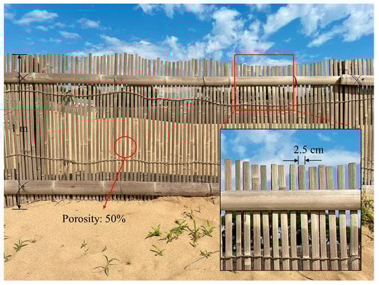 Sand fences are widely used to control wind-blown sand in coastal regions. The aerodynamics of sand fences have been mainly investigated by means of wind-tunnel experiments. Some studies have developed and applied numerical models to analyze the sand-trapping effects of sand fences [,]. The functions of sand fences depend on their geometrical design (including height, length, width, and porosity, as well as the size, geometry, and distribution of openings) and their geometric shape []. Of these factors, porosity has been suggested to be the most important structural characteristic controlling the sand-trapping efficiency of sand fences on the basis of both wind-tunnel experiments and numerical simulations [,]. Fences with a porosity of around 40−50% have been found to be the most effective at sand trapping in many field and wind-tunnel studies (e.g., [,,,]). Fence height may be relatively unimportant for the formation of a new dune (e.g., []), although it can affect the life span of fences []. Hotta et al. [] documented that the height of sand fences is usually between 0.6 and 1.3 m in field applications. The size, geometry, and distribution of openings in fences also affect the fence’s sand-trapping efficiency through their impact on wind turbulence, but these influences are not comparable with the effect of porosity. For a constant porosity, the sand-trapping efficiency decreases as the opening size increases. Fences with angular openings (e.g., vertical or horizontal slits) exhibit a higher sand-trapping efficiency than those with round edges (e.g., circular holes) [], and fences in which the porosity increases upward have a higher sand-trapping efficiency than those with decreasing upward porosity []. Straight fences have the advantage that they are faster to install and cost less, whereas zig-zag fences exhibit a high sand-trapping efficiency []. In addition, the arrangement (e.g., orientation relative to the wind) of a fence also influences the sand-trapping efficiency []. Fences perpendicular to the main wind direction are the most effective in trapping wind-blown sand, with their efficiency gradually decreasing as their orientation approaches parallel to the wind direction [].