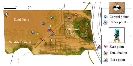 Orthophoto of the sand-trapping fences and sand-stabilizing fences in the study area based on images obtained on 13 May 2021. Lines L1, L2, and L3 are the transects used to measure elevation profiles; the arrow direction indicates the direction of distance measurements.
