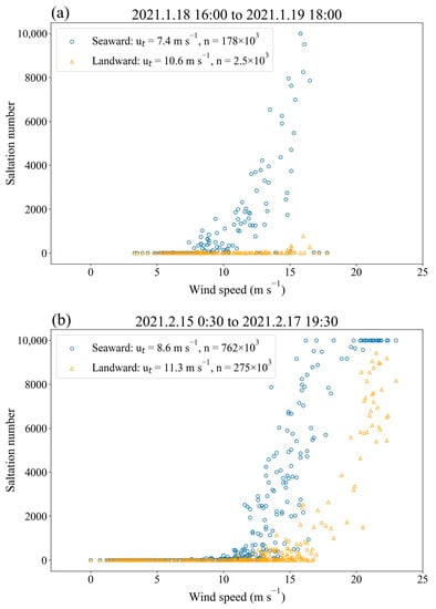During the observation period, significant sand saltation activity was observed during only two intervals, and saltation activity was large enough to reliably compare the threshold wind speed observed on the seaward and landward sides of the sand fence only during those intervals. The sand particle count on the seaward side was much higher than that on the landward side , particularly on January 18 and 19, when was approximately seventy times greater than (Figure 7). The blown sand was trapped by the sand fence; therefore, fewer sand saltation events were observed on the landward side of the fence. The mean threshold wind speeds on the seaward and landward sides during these two saltation activities were 7.4 m s−1 and 10.6 m s−1 in January (Figure 7a), and 8.6 m s−1 and 11.3 m s−1 in February (Figure 7b), respectively. Thus, the threshold wind speed on the seaward side of the sand fence was greater than that on the landward side, indicating effective sand trapping by the sand fences.