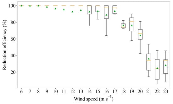 In the vertical profile of the relative blown-sand flux with a height that was measured inside the sand fence during the significant saltation activity in January, the relative blown-sand flux decayed exponentially with increasing height, and the relative blown-sand flux at 4 cm height accounted for approximately 20% of the total flux (Figure 8). We used the measured sand flux at 4 cm height to estimate the total sand flux in the near-ground surface layer and examined the mean reduction efficiency of the sand flux (Figure 9). The value of was 100% for wind speeds of 6–8 m s−1, indicating that all blown sand was trapped by the sand fence. The values slightly decreased and fluctuated between 88% and 98% as the wind speed increased to 17 m s−1, decreased to about 60% with a further wind speed increase to 20 m s−1, and fell sharply to less than 40% for wind speeds exceeding 20 m s−1. The median values of reduction efficiency were 100% for wind speeds of 6–13 m s−1, although there were some outliers for wind speeds of 8–13 m s−1 (not shown in Figure 9). The median maintained high values greater than 95% as wind speeds increased to 17 m s−1. These results indicate that sand fences effectively trap wind-blown sand at wind speeds lower than 17 m s−1.
