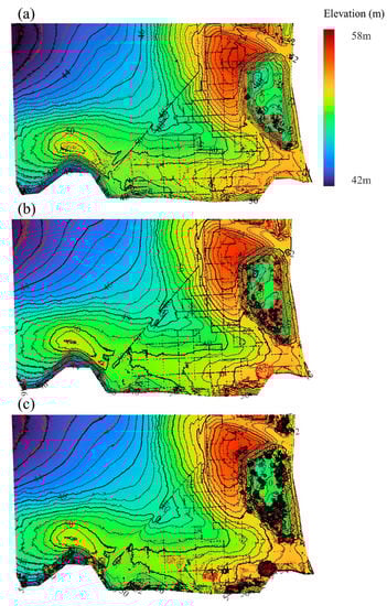 All the collected aerial images were processed using Agisoft Metashape Professional 1.7.1 software []. The photogrammetric processing was based on SfM and multi-view stereo algorithms [,] to generate DEMs. The loading aerial images were first aligned to detect the actual camera position for each image and refine camera calibration parameters. Then, the GCPs were imported as control points and check points to optimize camera alignment at a “high-accuracy” setting. After obtaining accurate estimates of camera position, the dense-point clouds were reconstructed at “high-quality” setting and incorrect points were removed manually. The density of the dense-point cloud resulted in 1240 point/m2. Finally, orthophotos and DEMs were generated with a spatial resolution of 2.8 cm/pixel. The coordinate system of the DEMs was transformed from WGS 84 to JGD2000-EPSG:2447. For accuracy assessment of the DEM, the root-mean-square error (RMSE) was calculated for the GCPs in the horizontal and vertical directions. The mean RMSE of the generated DEMs was 2.5 ± 0.4 m in the absence of GCPs. After calibration with GCPs, the RMSEs by use of the control points improved to 0.018 ± 0.005 m in horizontal resolution and 0.018 ± 0.007 m in vertical resolution. The mean allowable limit of accuracy for UAV photogrammetry was proposed to be 0.05 m by the Geospatial Information Authority of Japan [].