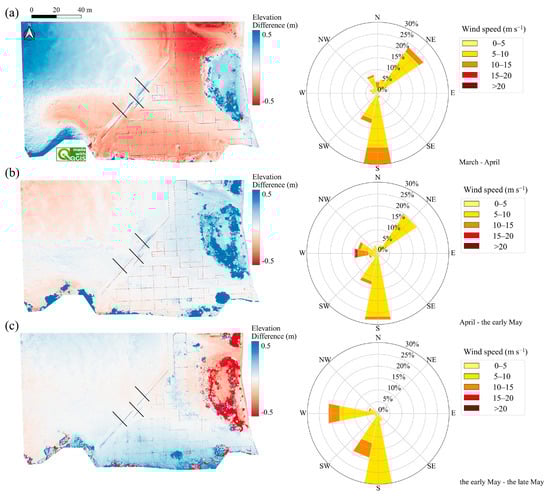 Elevation changes in the study area and wind distribution for (a) March to April, (b) April to early May, and (c) early to late May. Positive values indicate deposition of sand; negative values indicate erosion. Black lines are the corresponding L1, L2, and L3 transects given in Figure 3.