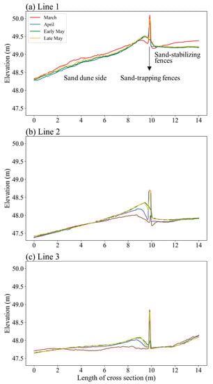 To clearly visualize the development of sand accumulation around the sand-trapping fences, we drew cross-section profiles perpendicular to those fences (Figure 12). Abrupt spikes less than 1 m high (equal to the height of the sand fence) are visible in each cross-section profile; we infer that they reflect the presence of the sand-trapping fence. However, the sand fence heights detected in each profile show some differences, because the sand fences cannot be appropriately visualized in the generated DEMs due to a lack of side textures from the ground objects captured from UAV photogrammetry []. The elevation changes in the three profiles indicate that most of the sand that accumulated during our observation period was on the sand dune side of the fences, whereas there was little change on the other sides of the fences. During March and April, a foredune developed on the sand dune side (i.e., leeward). The top of the dune was furthest from the fence in the L3 profile (Figure 12c), and closest in the L1 profile (Figure 12a). Sand continuously accumulated on the existing foredunes during April and May, even though strong westerly winds were observed. The most obvious increase in the elevation of the foredune occurred in the L2 profile (Figure 12b), indicating that the L2 sand-trapping fence trapped the largest amount of sand during this period. In addition, the foredunes gradually moved toward the sand-trapping fence during the observation period, and the sand-trapping function of these fences was gradually weakened as they became buried by the dunes.