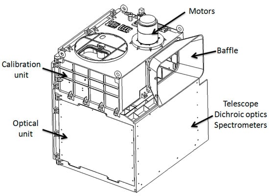 According to the function and performance requirements in Table 1, the GMI-II consists of the primary optics machine unit and calibration unit, as shown in Figure 2. The calibration unit mainly includes the 2D tracking mirror, calibration gate, light trap, diffuse reflector plate, and radiometer [33]. On the one hand, the 2D tracking mirror brings the sunlight into the instrument via a calibrated optical path to monitor changes in the instrument’s response in orbit. On the other hand, it enables wide-area spatial sampling by scanning along the track and cross-track. The primary optics machine unit is divided into five parts: telescope system, dichroic reflector module, collimation relay system, SHS, and secondary imaging system. The incident light is reflected by the 2D tracking mirror and enters the Gregory reflector telescope. Then the beam diameter is compressed and enters the dichroic reflectors. It is divided into four bands, and the SHS modulates the incident light of each band. The secondary imaging system images the interferogram to a CCD detector (759~769 nm band), a HgCdTe (MCT) detector (2043~2058 nm band), and two InGaAs detectors (1568~1583 nm, 1642~1658 nm band).