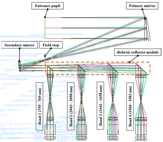 Based on the SNR review and the engineering experience of the preliminary principle prototype development, the interferometer components were pre-designed. Then the detailed design of the front telescope system, four-channel colour separation components and corresponding collimation system optical path were completed, and the front optical path layout is illustrated in Figure 3. Due to the wide detection band (757 nm to 2043 nm) and small FOV (14.6 mrad), a reflective system was considered, with a Gregorian off-axis telescope system consisting of parabolic and ellipsoidal mirrors without central blocking. The light beam is reflected by each channel’s corresponding dichroic reflector component into the corresponding collimation relay system to avoid achromatic aberrations. At the same time, considering that there are only two surfaces in the reflective optical system, we have used aspherical surfaces to control aberrations. In the design of the telescope system, in order to reduce the machining difficulty of the 2D tracking mirror and consider the necessary space required for the installation and movement of the 2D tracking mirror, we selected the 2D tracking mirror as the instrument entrance pupil to design the front function component of the optical system.
