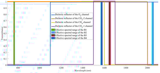 Figure 4 illustrates the distribution of spectral curves of the dichroic reflectors of four channels based on the reflection system’s spectral range (700~2100 nm). The GMI-II does not simply follow a wavelength sequence in its optical layout. First, the light below 1100 nm is reflected by the O2 channel; then, the 1550–1680 nm light is transmitted by the dichroic reflector of the CO2-2 channel. The channel layout is to reduce the pressure of the dichroic reflectors of the two adjacent spectral channels, CO2-1 and CH4, and to ensure the optical system efficiency of the short-wave infrared (SWIR) CO2-2 channel as much as possible.