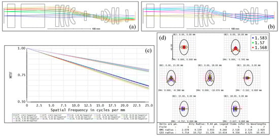 The design inputs include the following four requirements: (1) the object plane height, i.e., the exiting pupil position and the size of the collimating unit; (2) the object space NA (Numerical Aperture), which contains the grating dispersion in the effective wavelength range; (3) the object space telecentric system, i.e., the input to the collimating system is a quasi-parallel beam; (4) a fixed scaling ratio in the dispersion direction. At the same time, it is required that the length of the four channels’ imaging system should be the same as possible because, in the thermal design scheme, the cooling and heat dissipation surface of the detector with four channels is transmitted to the whole satellite +Y plane through the same panel.