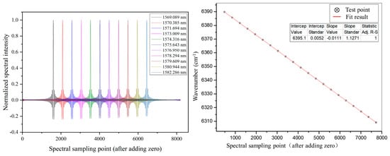 A spectral resolution test set-up is constructed using a tunable laser (± 5 pm wavelength accuracy), homogeneous integrating sphere, wavelength meter and power meter. The laser emits a monochromatic spectrum, which is introduced into the integrating sphere to form a uniform, quasi-Lambert surface light source at the exit. The wavelength and power meters are used to monitor the wavelength and power of the laser output. By collecting monochromatic interferograms of different wavelengths, spectral restoration was performed to obtain the instrument’s linear shape (ILS) at different wavelengths, and spectral resolution values were obtained after measuring FWHM values [40]. The monochromatic light recovery spectra and spectral calibration fit results of the CO2-1 channel are shown in Figure 13. The spectral resolution of the CO2-1 channel varies from 0.260 to 0.268 cm−1.