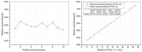 The absolute radiometric calibration accuracy is determined by: (1) the absolute radiometric uncertainty u ( a ) of the integrating sphere radiation source, quoting product parameters; (2) non-stability u ( b ) ¯ of the payload and (3) spectral response non-linearity u ( l ) ¯ of the payload. Multiple measurements of the integrating sphere radiation source under the same conditions were used to perform spectral recovery of the interferogram and to assess the stability and spectral response linearity of the spectral points. Figure 14 shows the spectral data stability and spectral response of the CO2-1 channel. The calculation of the non-stability u ( b ) λ and spectral response non-linearity u ( l ) λ at wavelength λ is shown in Equation (12).
