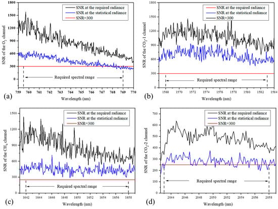 Figure 15. Spectral SNR curve for each channel of the GMI-II: (a) O2 channel; (b) CO2-1 channel; (c) CH4 channel; (d) CO2-2 channel.