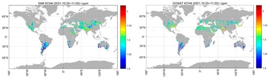 The XCH4 inversion sites of the GMI-II have 886 sites on a global scale. The global mean value of XCH4 from the GMI-II is 1.8879 ppm, corresponding to a regional mean value of 1.8946 ppm for the GOSAT XCH4 product. The mean CH4 concentrations detected by the GMI-II are slightly higher than those detected by the GOSAT, and the global distribution of CH4 concentrations follows the same trend, as shown in Figure 17.