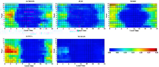 Occurrence rate of SF at Mohe, I-Cheon, Jeju, Wuhan, and Sanya according to the 0–24 LT and January–December division.