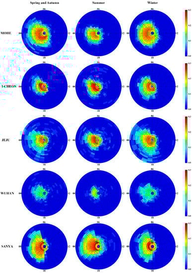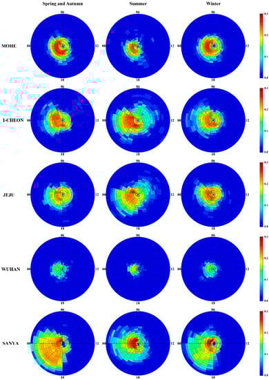 Frequency spread-F (FSF) index distribution in summer, winter, and equinox (spring and autumn) in Mohe, I-Cheon, Jeju, Wuhan, and Sanya, which is binned into the function of local time 0:00–24:00 LT and heights 200–500 km within a grid of 1 h × 20 km.