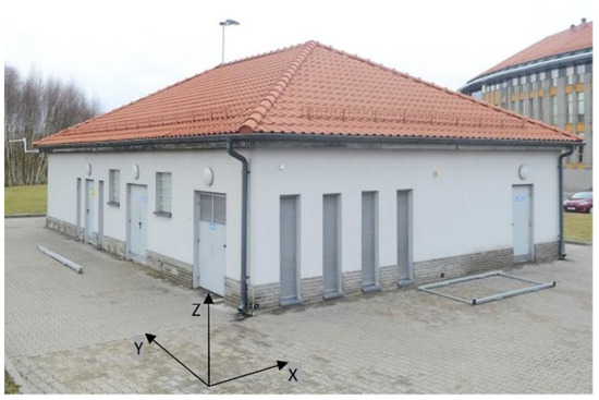 The test object is a medium size (16 m × 10 m × 6 m) building (Figure 1) in Olsztyn (B = 53.755434, L = 20.466847), Kortowo district. Diverse textures characterize the surface of elevations. The elevations of the building have large surfaces with a microporous texture. 32 artificial signalized (targeted) control points and additionally defined 18 natural control points are uniformly located on the building elevations (see CRBeDaSet_Signalized Points.pdf file of the CRBeDaSet online repository).