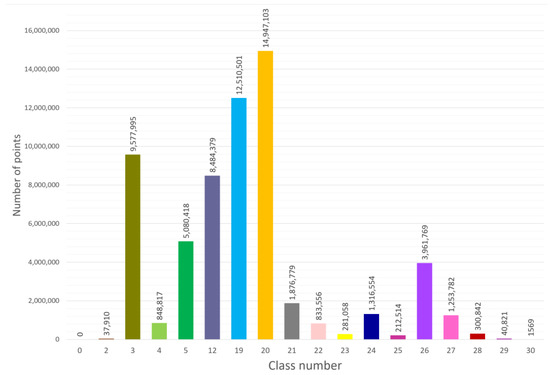 Then, the point cloud was manually denoised. All points which were acquired on humans, cars, and other objects in the move were removed. Additionally, points that represent the interior of the building (measured through the holes, windows, or glass) were removed. After that, to change the density of the points, the point cloud was filtered using the minimum space between points. The raw space between points (0.0001 m) was changed to 0.003 m, as it is enough to recognize even small objects, and the point cloud is not too large for machine and deep learning purposes. In the last step, the point cloud of the main object (building) and its surroundings were manually classified using the LoD3 standard, and 18 classes were specified. Semantic segmentation was performed in the pointly.ai web app. Due to this and the numbers of the classes being related to the ASPRS *.las format (http://www.asprs.org/wp-content/uploads/2019/03/LAS_1_4_r14.pdf, accessed on 22 April 2022) which also contains classes reserved for ASPRS definitions, the respective classes were used in this study: