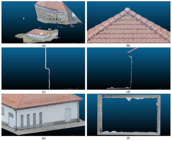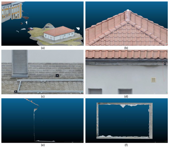 The point clouds merging fusion and data processing were carried out in the Leica Cyclone™ SCAN software. The global filtered point cloud for the test object CRBeDaSet consisted of ca. 250 million points (17.2 GB saved in *.pts file). The Leica ScanStation C10 is equipped with an auto-adjusting, integrated digital camera with a zoom video. In the project, each point was matched with the pixel color of a digital image. The visualization of the point cloud is presented in Figure 4a,b.