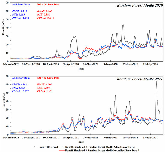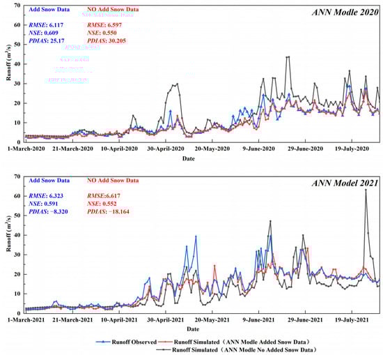 PBIAS increased from 7.399% to 9.380% in 2020 and 2021 after the introduction of snow cover remote sensing data. The overall impact of the model simulations on the PBIAS, although also increasing, is small. The improvement in the ANN model simulations during periods of high snowmelt flooding is mainly since the precipitation data inverted from the ERA5 atmospheric reanalysis data is the sum of the liquid and solid precipitation. Liquid precipitation can directly affect runoff by sinking into rivers; solid precipitation lags in its effect on the runoff due to altitude and climatic factors. Solid precipitation at low altitudes melts and flows into the runoff on the same day or the next day due to the high surface temperatures, solar radiation, and evapotranspiration. Solid precipitation at high altitudes does not affect the runoff immediately due to the lower temperatures, and is stored in the surface layer of the basin as seasonal snow, which melts and contributes to the river in the following spring when the temperature rises and recharges the runoff. In this study, considering the impact of the snow on runoff in the basin, the snow cover area and snow water equivalent were introduced into the model to reflect the seasonal changes in snow water equivalent in the basin, improve the lag of the solid precipitation on the runoff, and enhance the model’s simulation results for the snowmelt runoff.