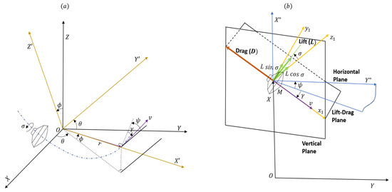 (a) Geometry of motion of entry vehicle. (b) Aerodynamic forces acting on the entry vehicle.